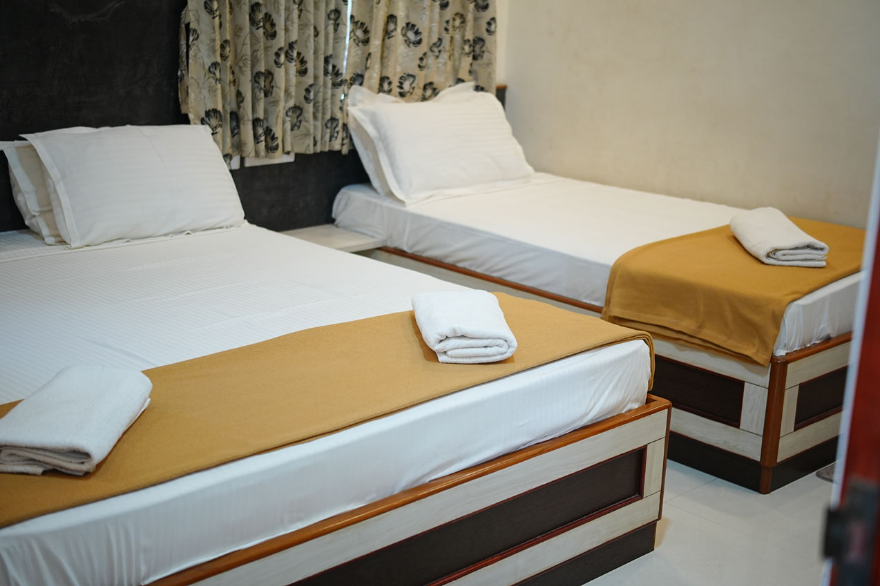 With spacious seating, comfortable bedding for three guests, and clean surroundings, this room ensures a pleasant stay for everyone. Whether you’re visiting for business or leisure, the Triple AC Room offers a cool, comfortable, and peaceful “home away from home” experience.